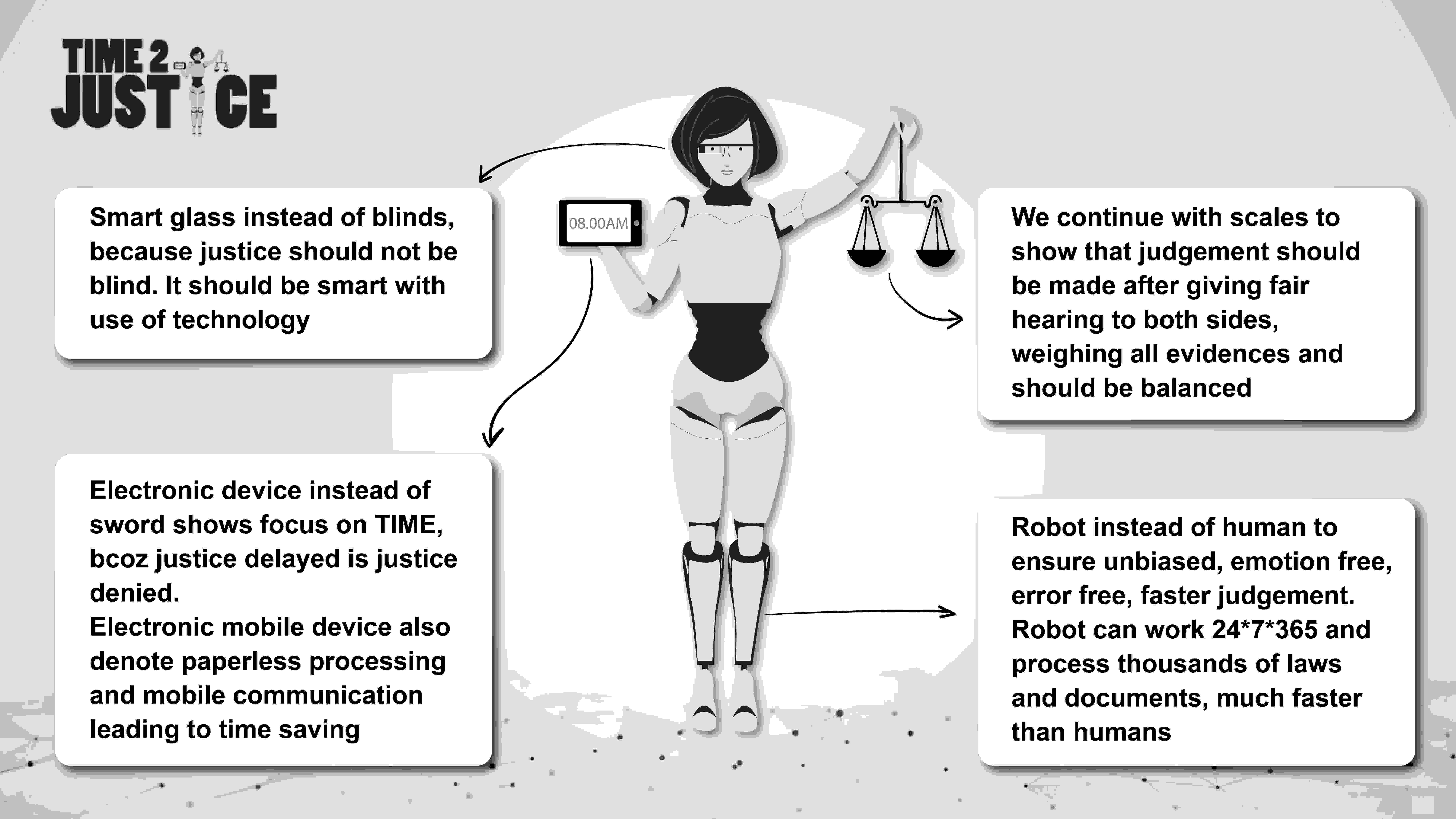 Time2Justice empowers lawyers, judges, and citizens. We aggregate laws and historic judgements in the cloud, using AI to interpret applicable law in a flash. Think of it as a Robo-judge that works 24/7, effectively reading through millions of documents in seconds.